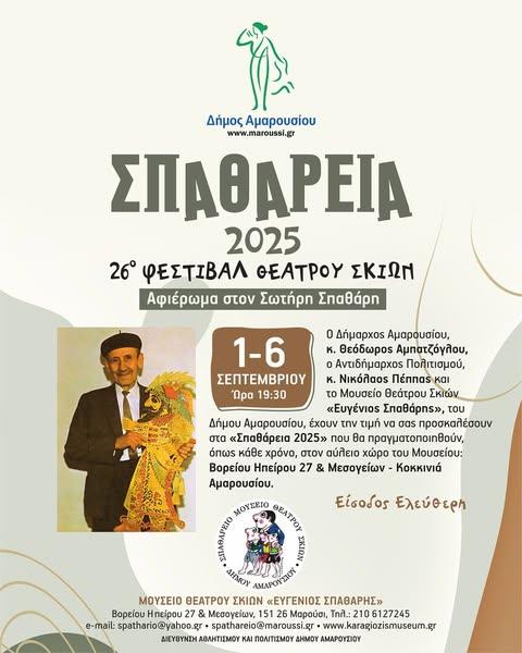 Ο Δήμος Αμαρουσίου και το Μουσείο Θεάτρου Σκιών «Ευγένιος Σπαθάρης» διοργανώνουν τα «Σπαθάρεια 2025», από 1 μέχρι και 6 Σεπτεμβρίου, ώρα 19:30.