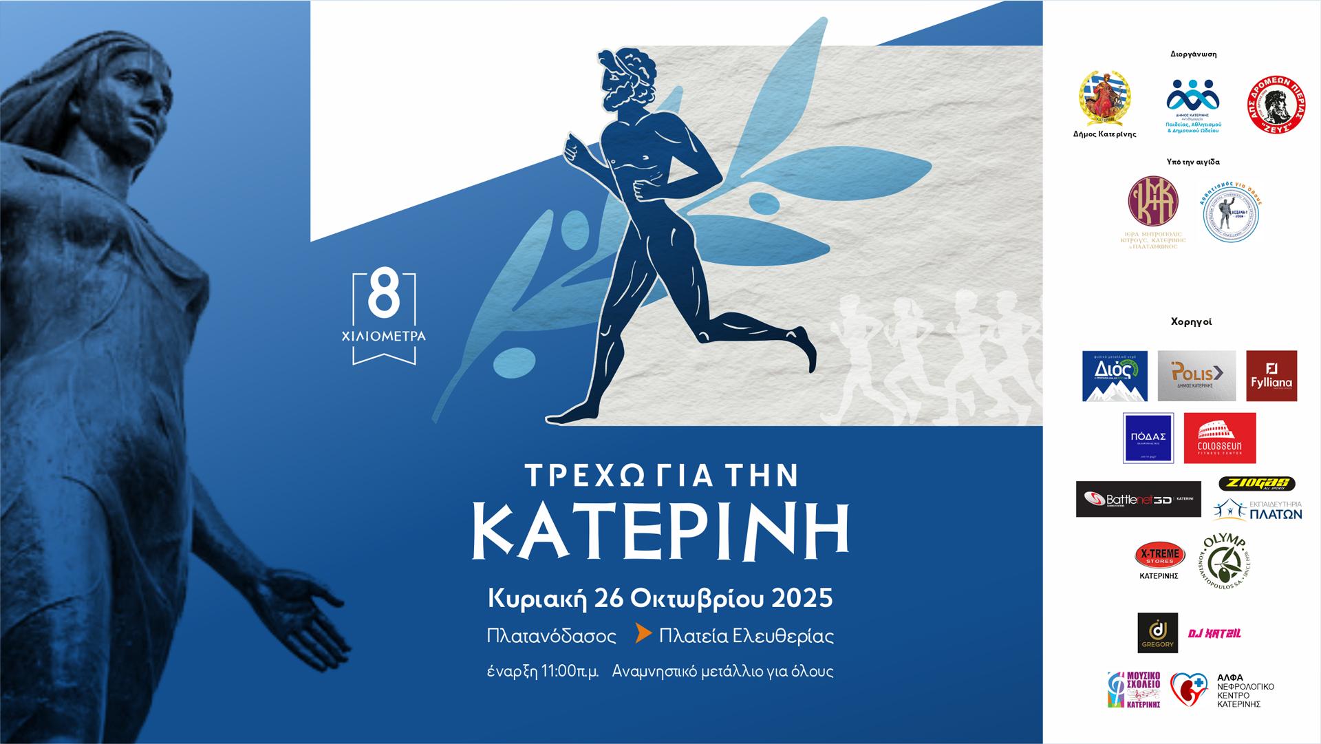 Ο Δήμος Κατερίνης, μέσω της Αντιδημαρχίας Παιδείας, Αθλητισμού & του Δημοτικού Ωδείου (Τμήμα Αθλητικής Ανάπτυξης), και ο Αθλητικός Πολιτιστικός Σύλλογος Δρομέων Πιερίας «Ζευς» διοργανώνουν και προκηρύσσουν τον 12ο Αγώνα Δρόμου 8 χιλιομέτρων, με την επωνυμία «Τρέχω για την Κατερίνη».