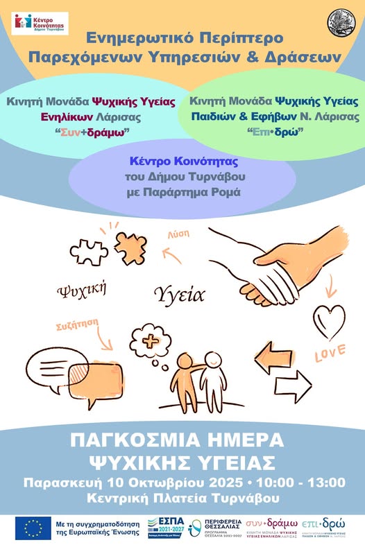 Με αφορμή την Παγκόσμια Ημέρα Ψυχικής Υγείας (γιορτάζεται στις 10 Οκτωβρίου), το Κέντρο Κοινότητας του Δήμου Τυρνάβου και το Κέντρο Κοινότητας με παράρτημα ΡΟΜΑ σε συνεργασία με την Κινητή Μονάδα Ψυχικής Υγείας Ενηλίκων Λάρισας ‘’Συν + δράμω’’ και την Κινητή Μονάδα Ψυχικής Υγείας Παιδιών και Εφήβων ‘’Επι·δρώ’’ του νομού Λάρισας διοργανώνουν ενημερωτικό περίπτερο στην Κεντρική Πλατεία του Τυρνάβου.