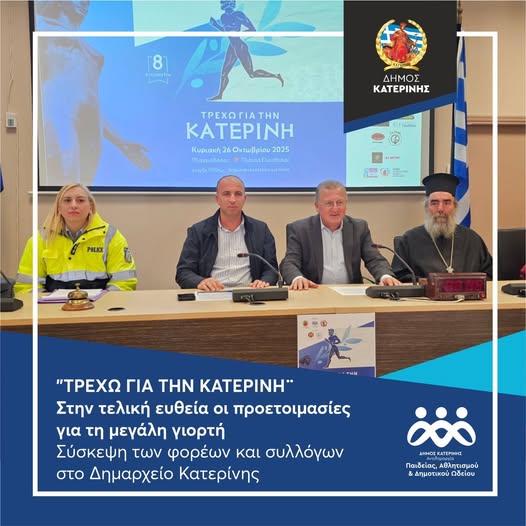 “Στις 26 Οκτωβρίου, η Κατερίνη θα γιορτάσει την απελευθέρωσή της φορώντας τα αθλητικά της. Ο αγώνας δρόμου που διοργανώνει σε συνεργασία με τον σύλλογο “ΖΕΥΣ”, υπό την αιγίδα της Μητρόπολης, με την καθοριστική συμβολή της Διεύθυνσης Αστυνομίας, της Τροχαίας, δεν είναι απλώς μια αθλητική εκδήλωση. Είναι ένας αγώνας, ένας ζωντανός περίπατος στην ιστορία και τη μνήμη της πόλης μας”. Με αυτά τα λόγια, ο Δήμαρχος Κατερίνης, Ιωάννης Ντούμος, καλωσόρισε στη διάρκεια της σύσκεψης που πραγματοποιήθηκε σήμερα στο Δημαρχείο τους εκπροσώπους των εμπλεκομένων φορέων & συλλόγων της διοργάνωσης του αγώνα δρόμου «ΤΡΕΧΩ ΓΙΑ ΤΗΝ ΚΑΤΕΡΙΝΗ».