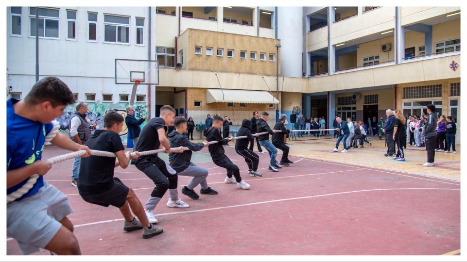 Συγκεκριμένα, οι μαθητές και οι μαθήτριες είχαν την ευκαιρία να γνωρίσουν από κοντά το άθλημα της διελκυστίνδας, μέσα από μια βιωματική δράση που πραγματοποιήθηκε στον προαύλιο χώρο του σχολείου, στο πλαίσιο του προγράμματος γνωριμίας μαθητών με αθλήματα του Υπουργείου Παιδείας, Θρησκευμάτων και Αθλητισμού.