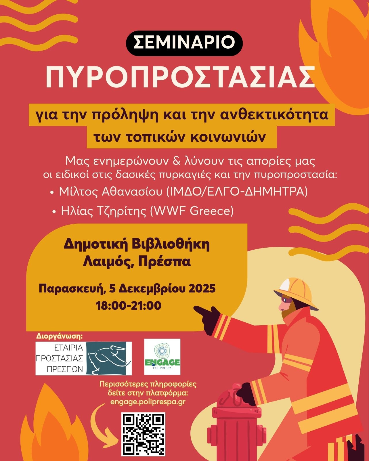 Πρόκειται για ένα ανοιχτό σεμινάριο για την πρόληψη των δασικών πυρκαγιών και την προστασία των τοπικών κοινωνιών και της ιδιωτικής περιουσίας που διοργανώνει η Εταιρία Προστασίας Πρεσπών, σε συνεργασία με το engage.poliprespa.gr.