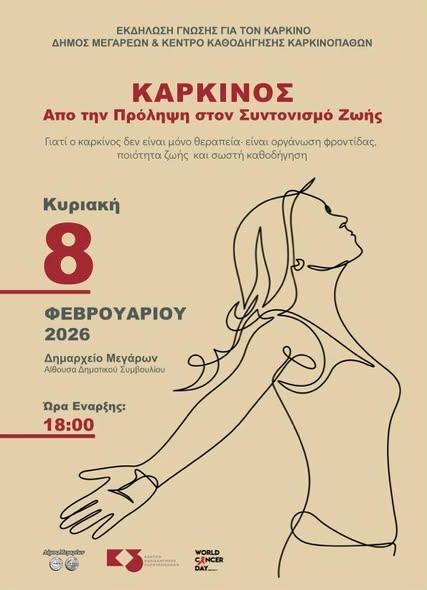 Ο Δήμος Μεγαρέων και το Κέντρο Καθοδήγησης Καρκινοπαθών – Κάπα3, με αφορμή την Παγκόσμια Ημέρα κατά του Καρκίνου, διοργανώνουν την Κυριακή 8 Φεβρουαρίου, στις 18:00, στην Αίθουσα Δημοτικού Συμβουλίου του Δημαρχείου Μεγάρων, την εκδήλωση – ημερίδα με θέμα «Καρκίνος: Από την Πρόληψη στον Συντονισμό Ζωής».
