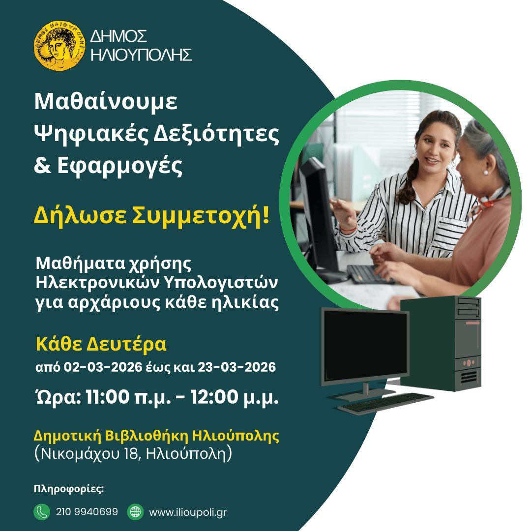 Το πρόγραμμα θα πραγματοποιείται στις εγκαταστάσεις του Media Lab της Βιβλιοθήκης κάθε Δευτέρα, 11:00-12:00 από 02-03-2026 έως και 23-03-2026 και απευθύνεται κατά κύριο λόγο σε αρχάριους χρήστες υπολογιστών κάθε ηλικίας που θέλουν να βελτιώσουν τις ψηφιακές τους ικανότητες και να αναβαθμίσουν τις γνώσεις τους.