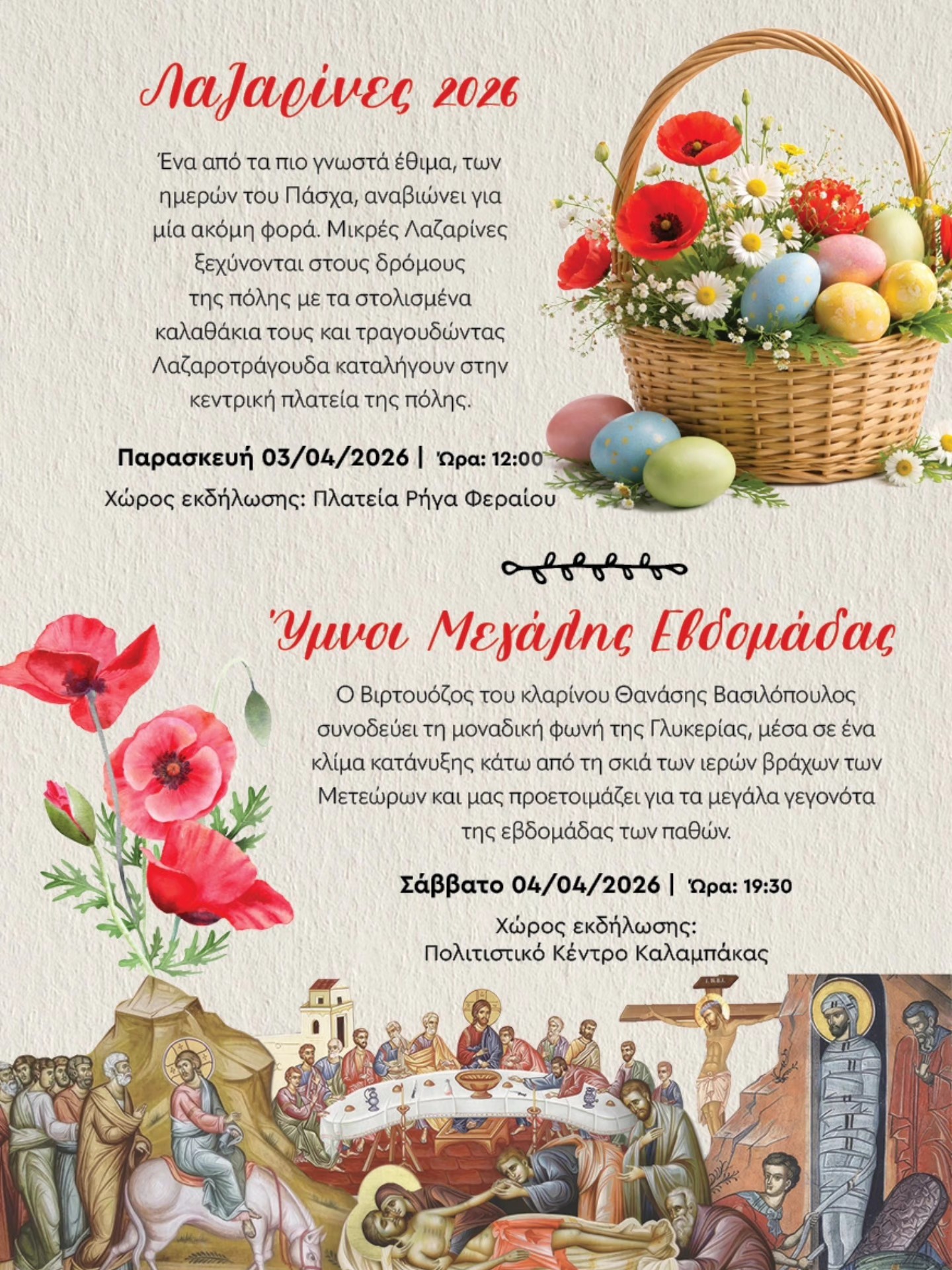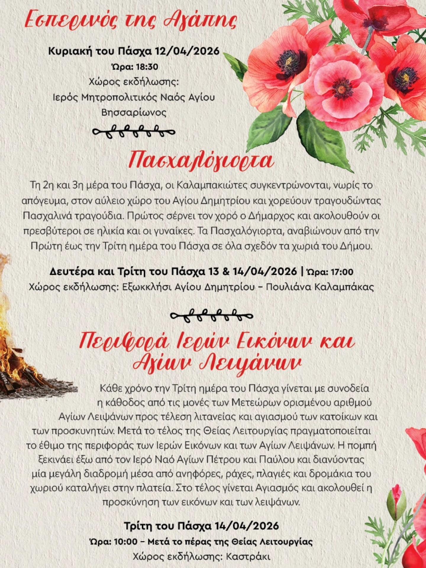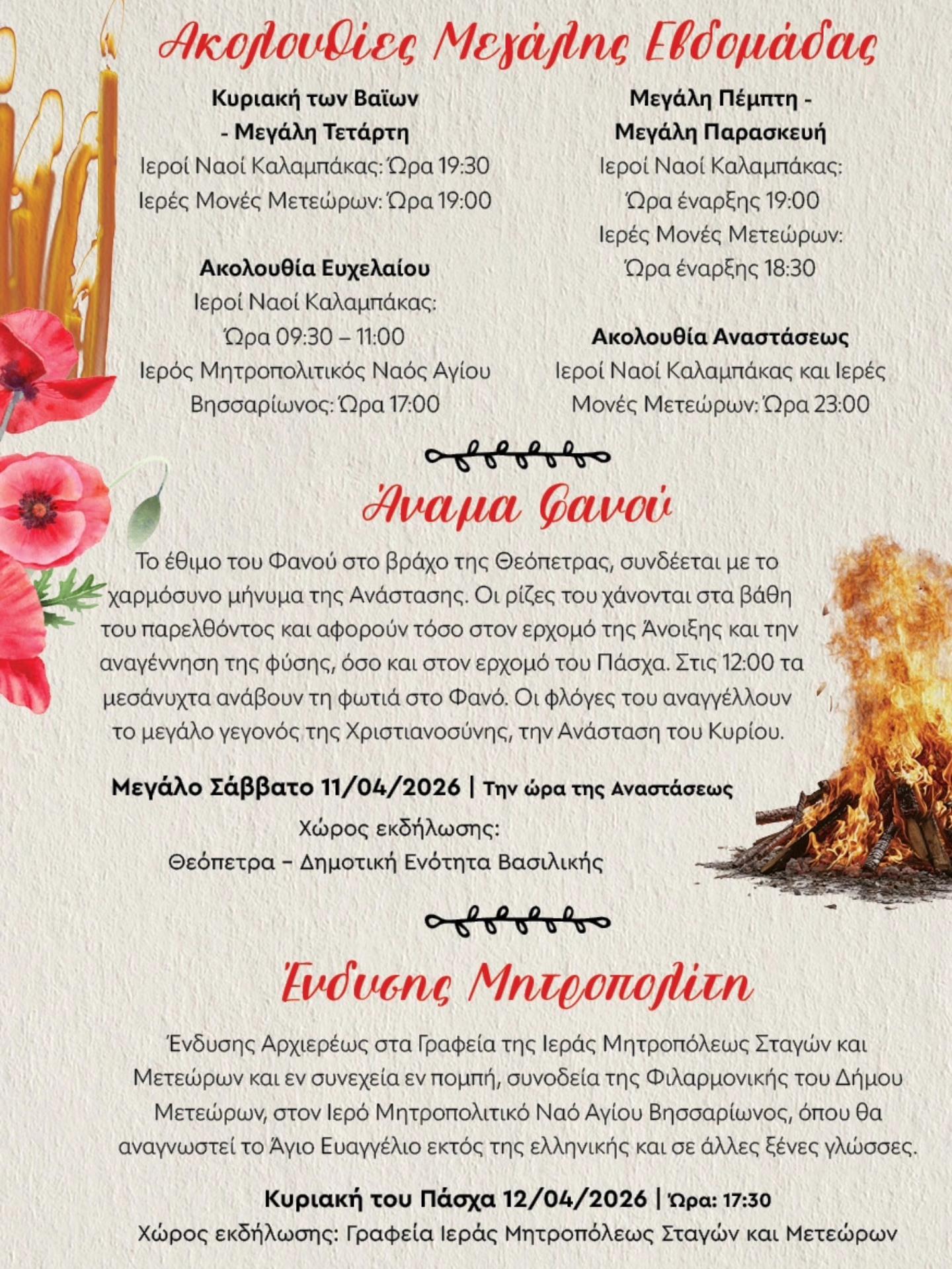 Ο Δήμος Μετεώρων παρουσιάζει ένα πλούσιο και ιδιαίτερο πρόγραμμα εκδηλώσεων για το Πάσχα, αναδεικνύοντας τον μοναδικό συνδυασμό θρησκευτικότητας, παράδοσης και πολιτισμού που χαρακτηρίζει την περιοχή.