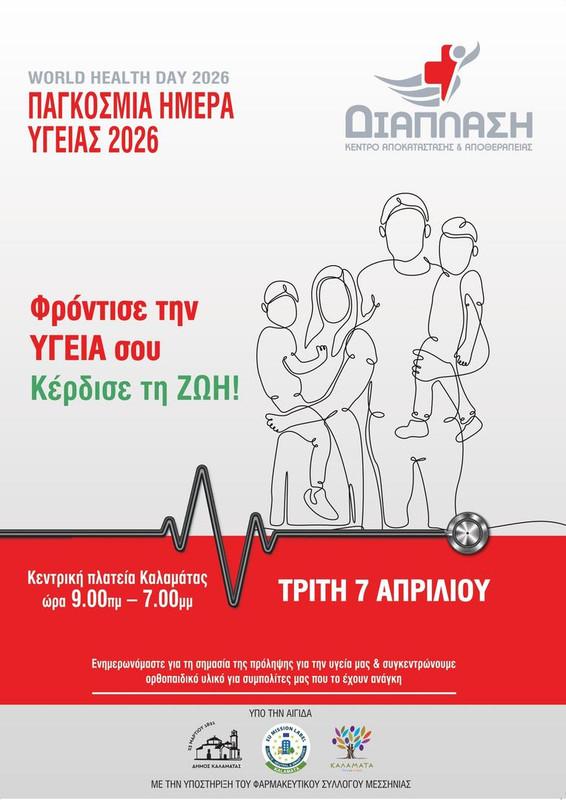 Το Κέντρο Αποκατάστασης «Διάπλαση», με αφορμή την Παγκόσμια Ημέρα Υγείας, στις 7 Απριλίου, διοργανώνει δράση ενημέρωσης και ευαισθητοποίησης για την πρόληψη, στην Κεντρική Πλατεία – Βασ. Γεωργίου της Καλαμάτας. Η εκδήλωση τελεί υπό την αιγίδα του Δήμου Καλαμάτας και πραγματοποιείται με την υποστήριξη του Φαρμακευτικού Συλλόγου Μεσσηνίας.