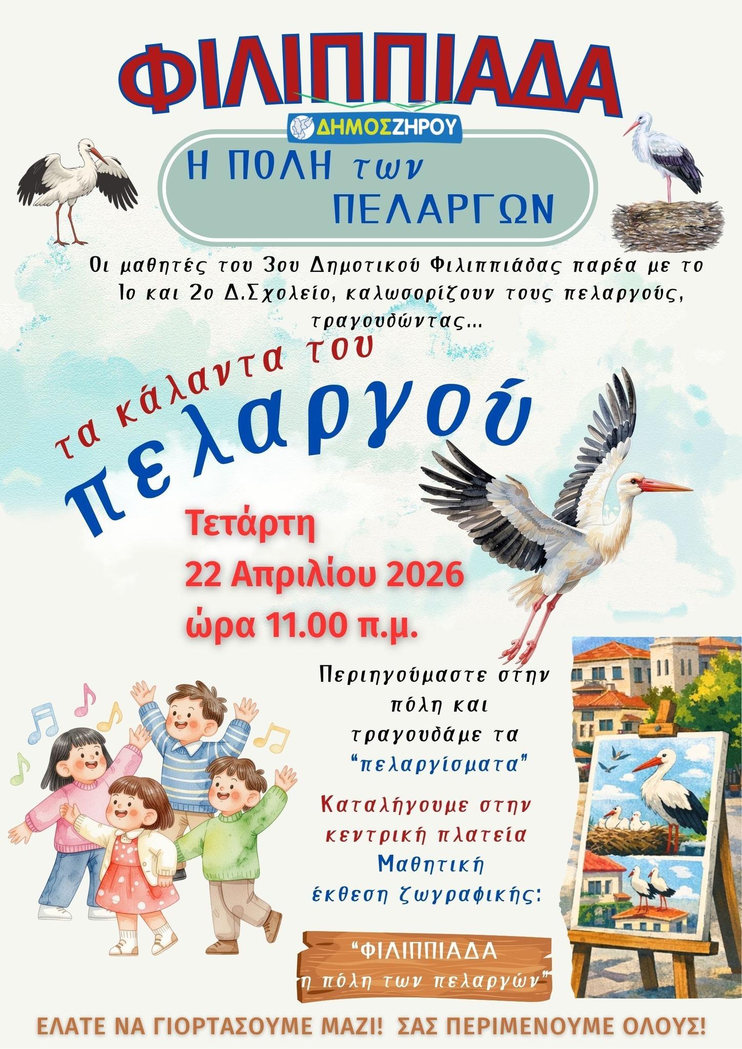 Ο Δήμος Ζηρού, μαζί με τους μαθητές του 3ου Δημοτικού Σχολείου Φιλιππιάδας, και σε συνεργασία με το 1ο και 2ο Δημοτικό, προσκαλούν μικρούς και μεγάλους σε μια ξεχωριστή, χαρούμενη δράση αφιερωμένη στην άφιξη των πελαργών στην πόλη της Φιλιππιάδας.