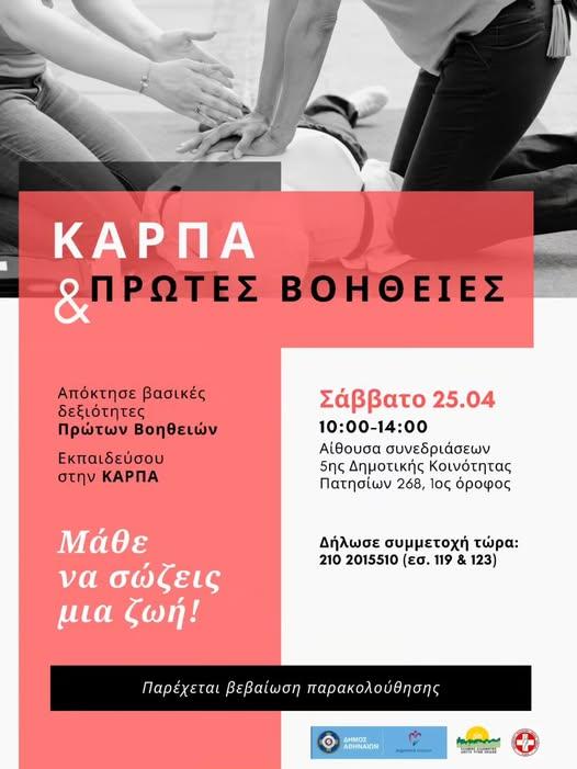 Ο Δήμος Αθηναίων, σε συνεργασία με το Ελληνικό Διαδημοτικό Δίκτυο Υγιών Πόλεων και την Εθελοντική Διασωστική Ομάδα Κρίσεων, προσκαλεί όλους τους δημότες στο πρώτο διαδραστικό Σεμινάριο Πρώτων Βοηθειών, το Σάββατο, 25 Απριλίου 2026, από τις 10:00 έως τις 14:00, στην Αίθουσα Συνεδριάσεων της 5ης Δημοτικής Κοινότητας (Πατησίων 268, 1ος όροφος).