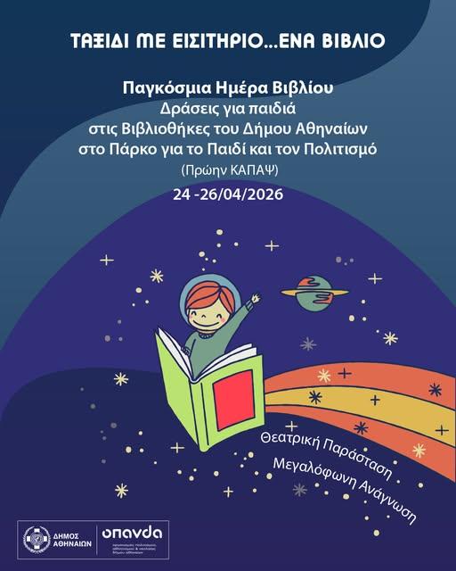 Ο Οργανισμός Πολιτισμού, Αθλητισμού και Νεολαίας του Δήμου Αθηναίων, με αφορμή την Παγκόσμια Ημέρα Βιβλίου, διοργανώνει τριήμερες εκδηλώσεις φιλαναγνωσίας για παιδιά και οικογένειες στο Πάρκο για το Παιδί και τον Πολιτισμό.