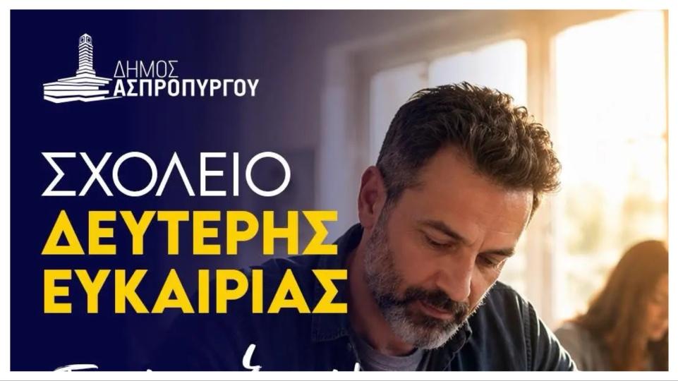 Την έναρξη της περιόδου εγγραφών στο Σχολείο Δεύτερης Ευκαιρίας ανακοίνωσε ο δήμος Ασπροπύργου, στέλνοντας το μήνυμα «Ξεκίνα ξανά! Άλλαξε το αύριο!» σε όσους θέλουν να ολοκληρώσουν τις σπουδές που άφησαν στη μέση.