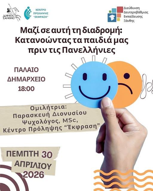 Με κεντρικό θέμα «Μαζί σε αυτή τη διαδρομή: Κατανοώντας τα παιδιά μας πριν τις Πανελλήνιες», η εκδήλωση θα πραγματοποιηθεί την Πέμπτη, 30 Απριλίου 2026, στις 18:00, στην αίθουσα του Παλαιού Δημαρχείου.