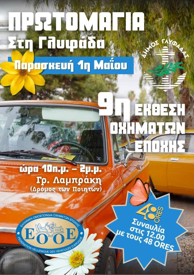 Στον εμπνευσμένο πεζόδρομο του εμπορικού κέντρου της πόλης, στο «Δρόμο των Ποιητών», ο Δήμος Γλυφάδας σε συνεργασία με την Ελληνική Ομοσπονδία Οχημάτων Εποχής (Ε.Ο.Ο.Ε.) και τα σωματεία – μέλη της, συνδιοργανώνουν μια πρωτομαγιάτικη γιορτή που έγινε θεσμός. Περισσότερα από 100 οχήματα αντίκες – σκαθάρια, στρατιωτικά τζιπ, λεωφορεία εποχής και πολλά πολλά άλλα από τις δεκατίες του ’40, του ’50, του ’60- θα είναι από τις 10:00 το πρωί έως τις 2:00 το μεσημέρι απλωμένα σε κάθετη διάταξη γύρω από τον πεζόδρομο της Λαμπράκη, ενώ στις 12 θα ξεκινήσει συναυλία με τους 48 ORES.