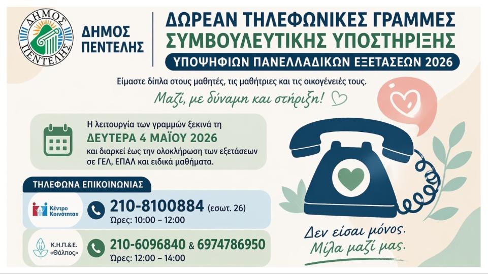 Χέρι βοήθειας και στήριξης στους μαθητές- υποψηφίους των Πανελλαδικών εξετάσεων και τις οικογένειές τους τείνει ο δήμος Πεντέλης, θέτοντας σε λειτουργία τηλεφωνικές γραμμές συμβουλευτικής και ψυχολογικής υποστήριξης.