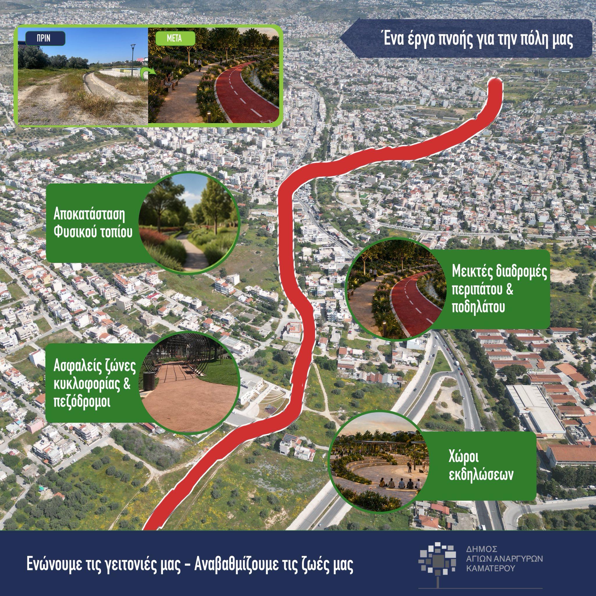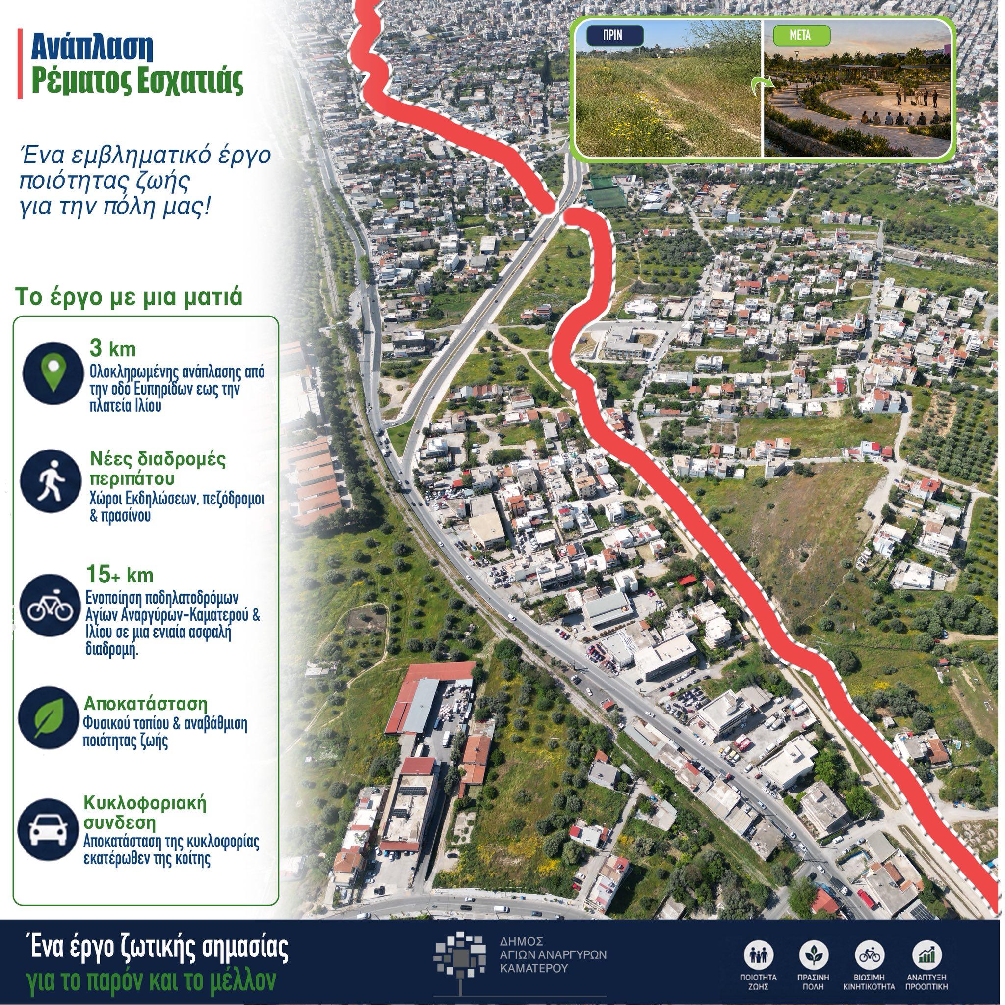 Από το 2020, η ανάπλαση του Ρέματος της Εσχατιάς αποτελεί για τη Δημοτική Αρχή Αγίων Αναργύρων – Καματερού μια σταθερή διεκδίκηση και για τον Δήμαρχο, Σταύρο Τσίρμπα, έναν προσωπικό στόχο με ξεκάθαρο όραμα: να μετατραπεί μια περιοχή με χρόνια προβλήματα, αλλά και μεγάλες δυνατότητες, σε έναν σύγχρονο, ασφαλή και ζωντανό δημόσιο χώρο για όλους.