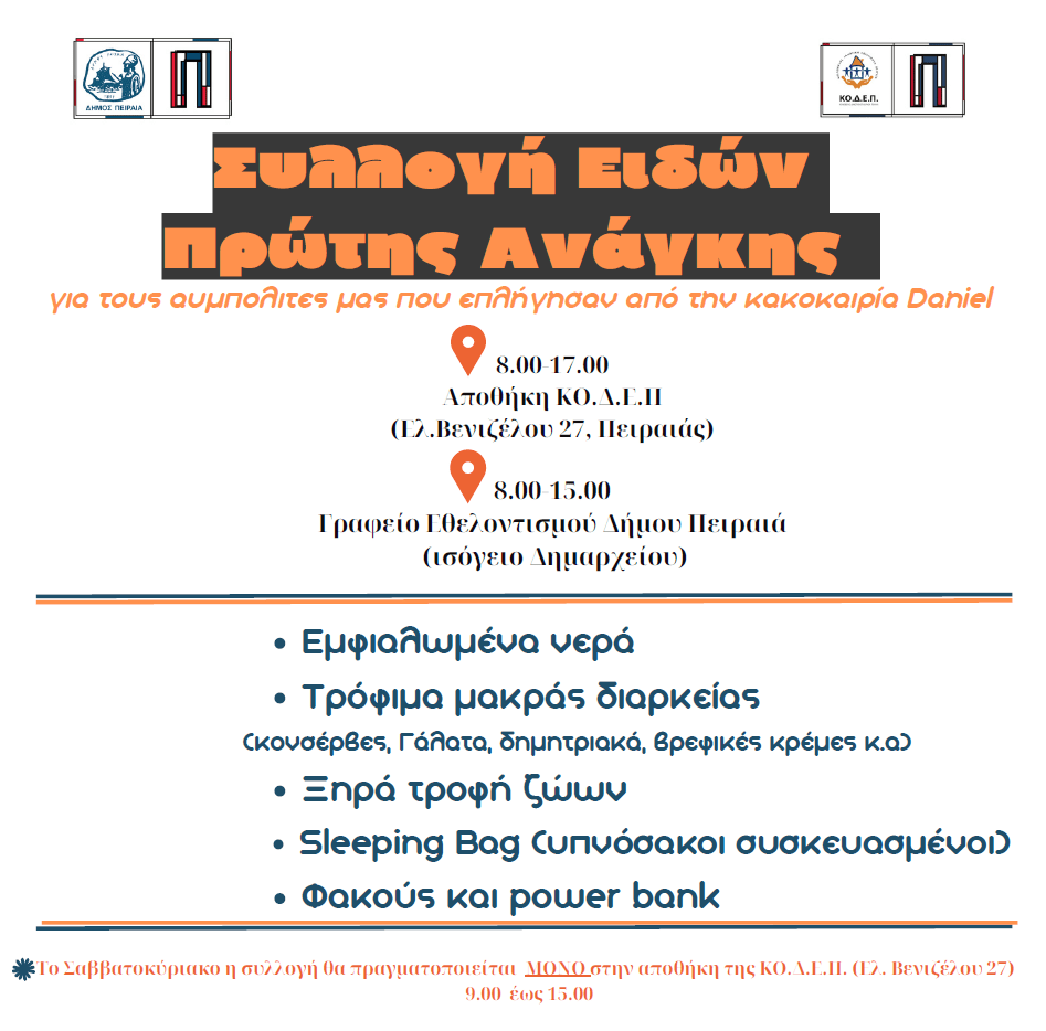 Ο Δήμος Πειραιά και η Κοινωφελής Δημοτική Επιχείρηση Πειραιά συγκεντρώνουν είδη πρώτης ανάγκης, προκειμένου να στηρίξουν έμπρακτα τους συνανθρώπους μας, οι οποίοι επλήγησαν από τις καταστροφικές πλημμύρες της κακοκαιρίας «Daniel».