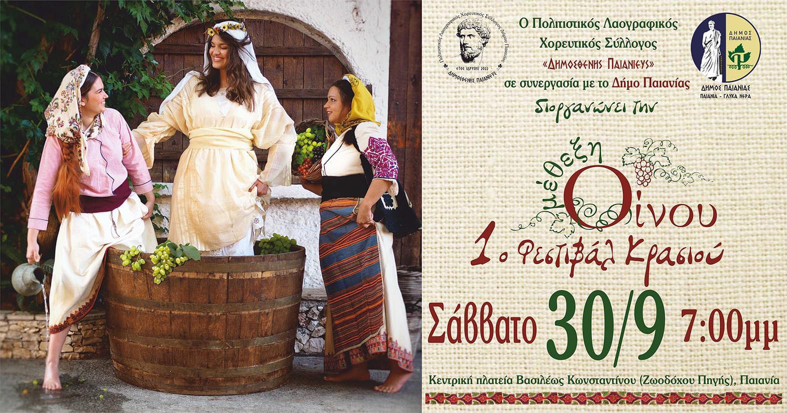 Ο Δήμος Παιανίας και ο Πολιτιστικός Λαογραφικός Χορευτικός Σύλλογος Παιανίας «Δημοσθένης Παιανιεύς» διοργανώνουν το 1ο Φεστιβάλ Κρασιού «ΟΙΝΟΥ ΜΕΘΕΞΗ», το Σάββατο 30 Σεπτεμβρίου στις 19.00 στην κεντρική πλατεία της Παιανίας (Β. Κωνσταντίνου).