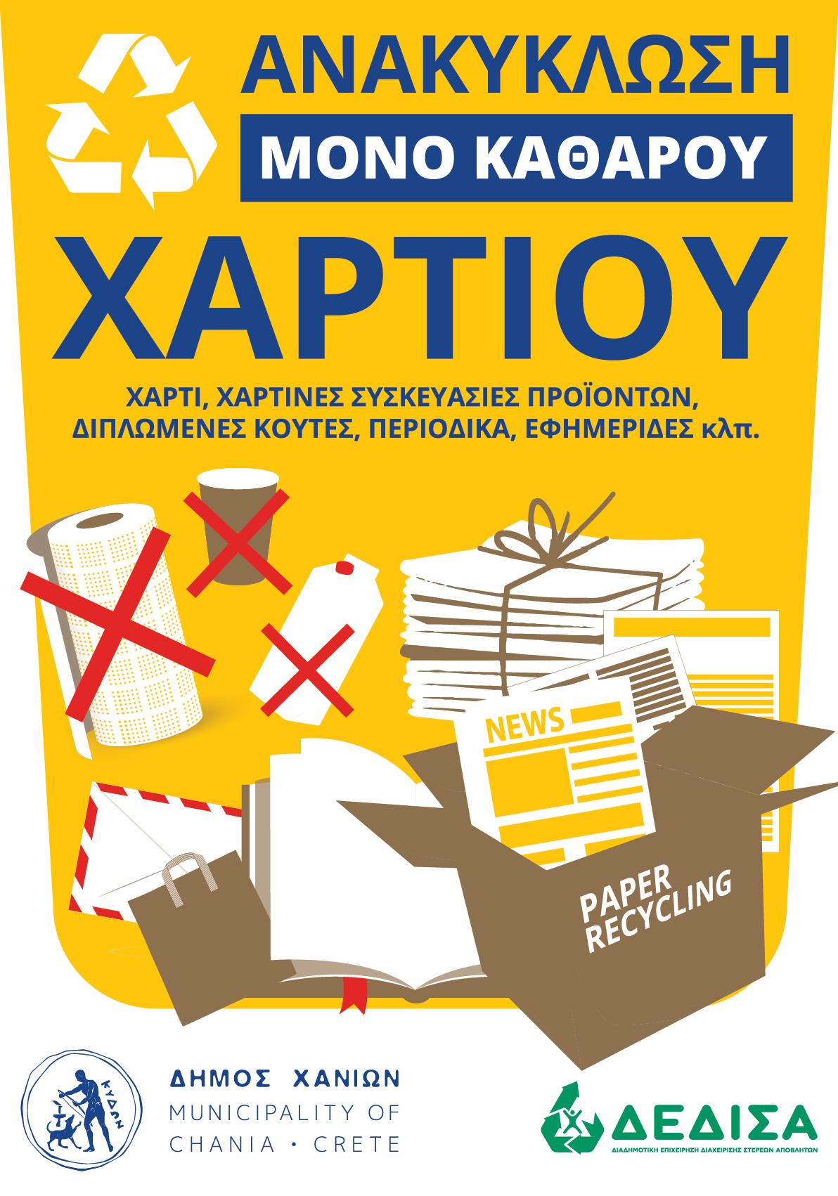 Μέχρι σήμερα η ανακύκλωση απορριμμάτων γινόταν μαζικά και το έντυπο χαρτί συλλεγόταν στους εξωτερικούς μπλε κάδους μαζί με τις υπόλοιπες χάρτινες & λοιπές συσκευασίες, πλην των γυάλινων. Βάση όμως του νέου νομοθετικού πλαισίου, όλοι οι ΟΤΑ Α΄ βαθμού είναι υποχρεωμένοι να οργανώνουν & να συλλέγουν χωριστά το καθαρό χαρτί. Με τη σειρά του, ο Δήμος Χανίωνπροχώρησε στην υλοποίηση των ανωτέρω και τοποθέτησε συνολικά 152 εξωτερικούςμπλε κάδους με κίτρινο καπάκι, χωρητικότητας 1.100lt, τόσο πλησίον των κτιρίων της αρμοδιότητάς του, όσο & σε λοιπές Δημόσιες Υπηρεσίες, δομές υγείας, φορείς εκπαίδευσης, κοινωνικές δομές και πολιτιστικές υποδομές, καθώς και σε σχολικές μονάδες για τη χωριστή συλλογή του ΧΑΡΤΙΟΥ.