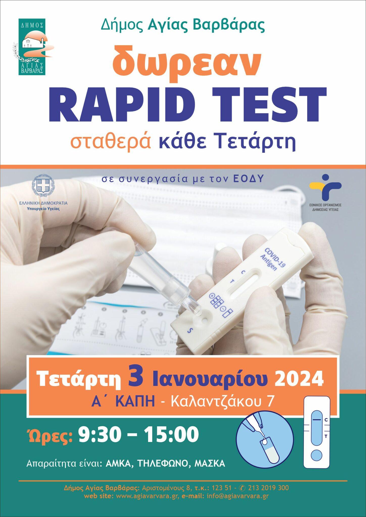 Επόμενο δωρεάν Rapid Test: Τετάρτη 3/1/2024, και ώρες 9:30 με 15:00.