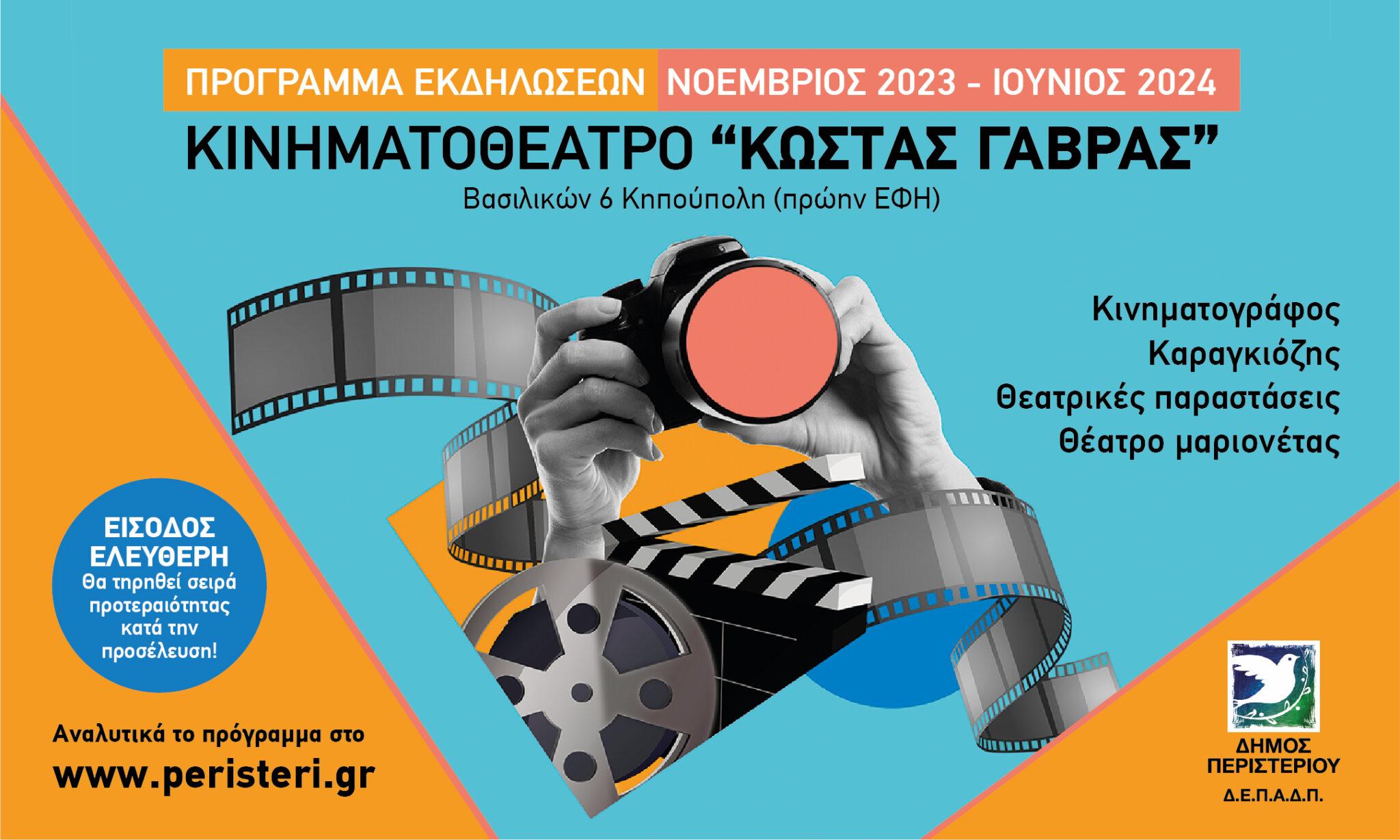 Στο Κινηματοθέατρο “Κώστας Γαβράς” του Δήμου Περιστερίου (Βασιλικών 6, Κηπούπολη) διοργανώνονται ξεχωριστές πολιτιστικές δράσεις. H είσοδος είναι ελεύθερη. Θα τηρηθεί σειρά προτεραιότητας κατά την προσέλευση. Το πρόγραμμα συνεχίζεται ως εξής: