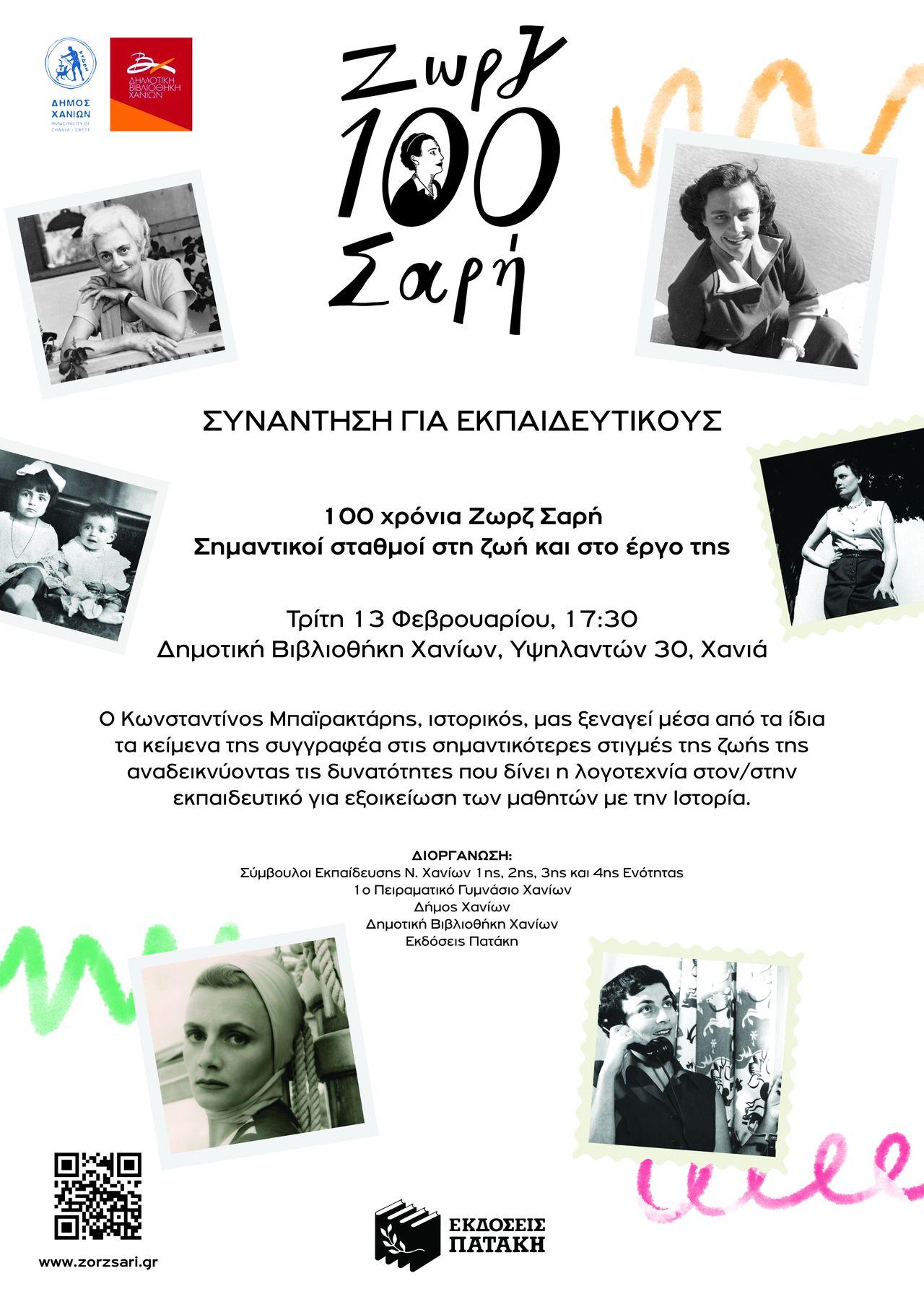 Συνάντηση για εκπαιδευτικούς, με θέμα: «100 χρόνια Ζωρζ Σαρή. Σημαντικοί σταθμοί στη ζωή και στο έργο της», διοργανώνεται την Τρίτη 13 Φεβρουαρίου, στις 17.30, στη Δημοτική Βιβλιοθήκη των Χανίων (Υψηλαντών 30).