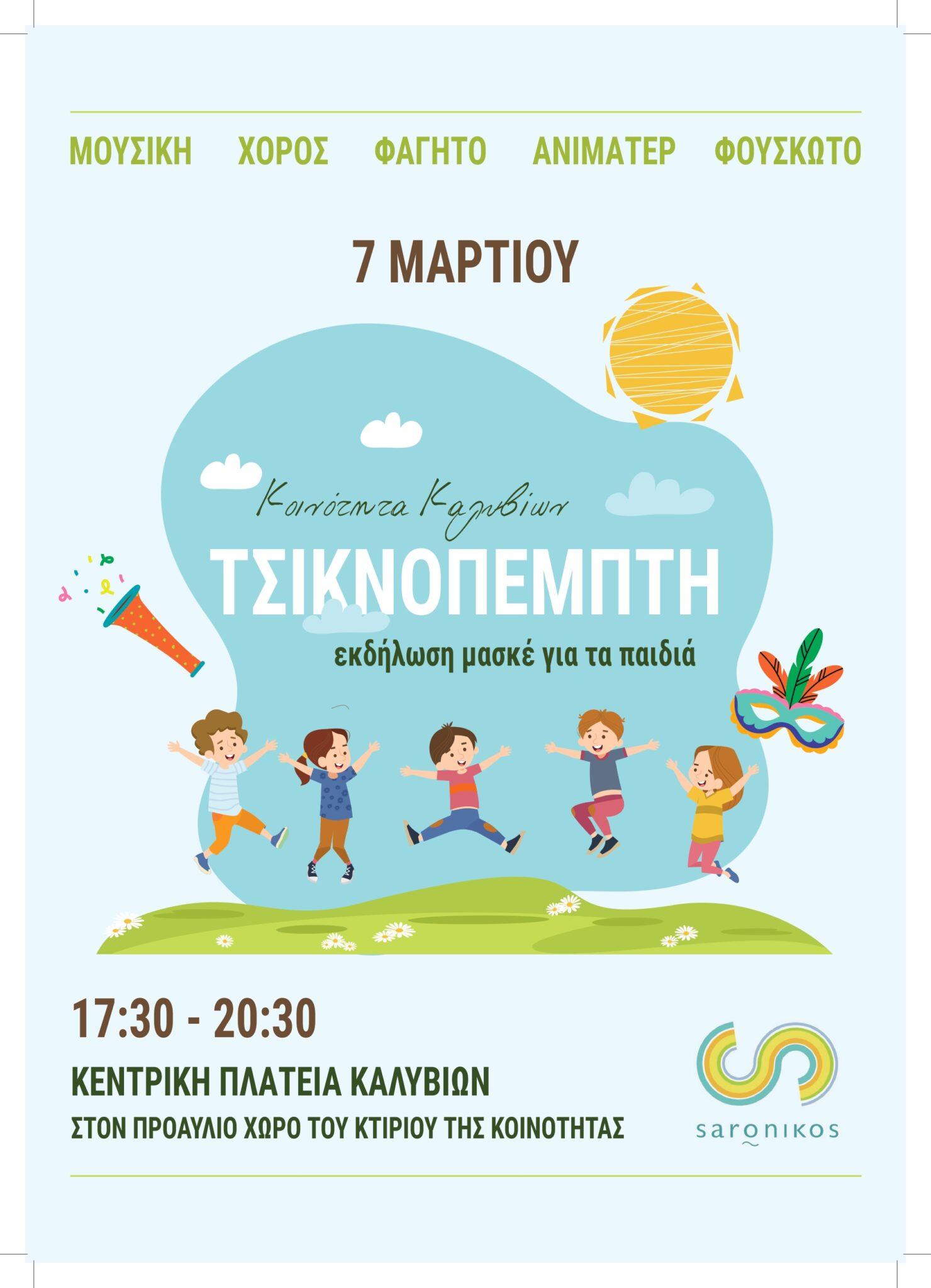Μια πολύ όμορφη γιορτή για τα παιδιά διοργανώνει η Κοινότητα Καλυβίων για την Τσικνοπέμπτη 7 Μαρτίου, στον προαύλιο χώρο του κτιρίου της Κοινότητας, στην κεντρική πλατεία Καλυβίων. Από τις 17:30 ως τις 20:30 οι μικροί μας φίλοι μπορούν να φορέσουν τις αποκριάτικες στολές τους και να έρθουν να διασκεδάσουμε με πολύ-πολύκέφι!