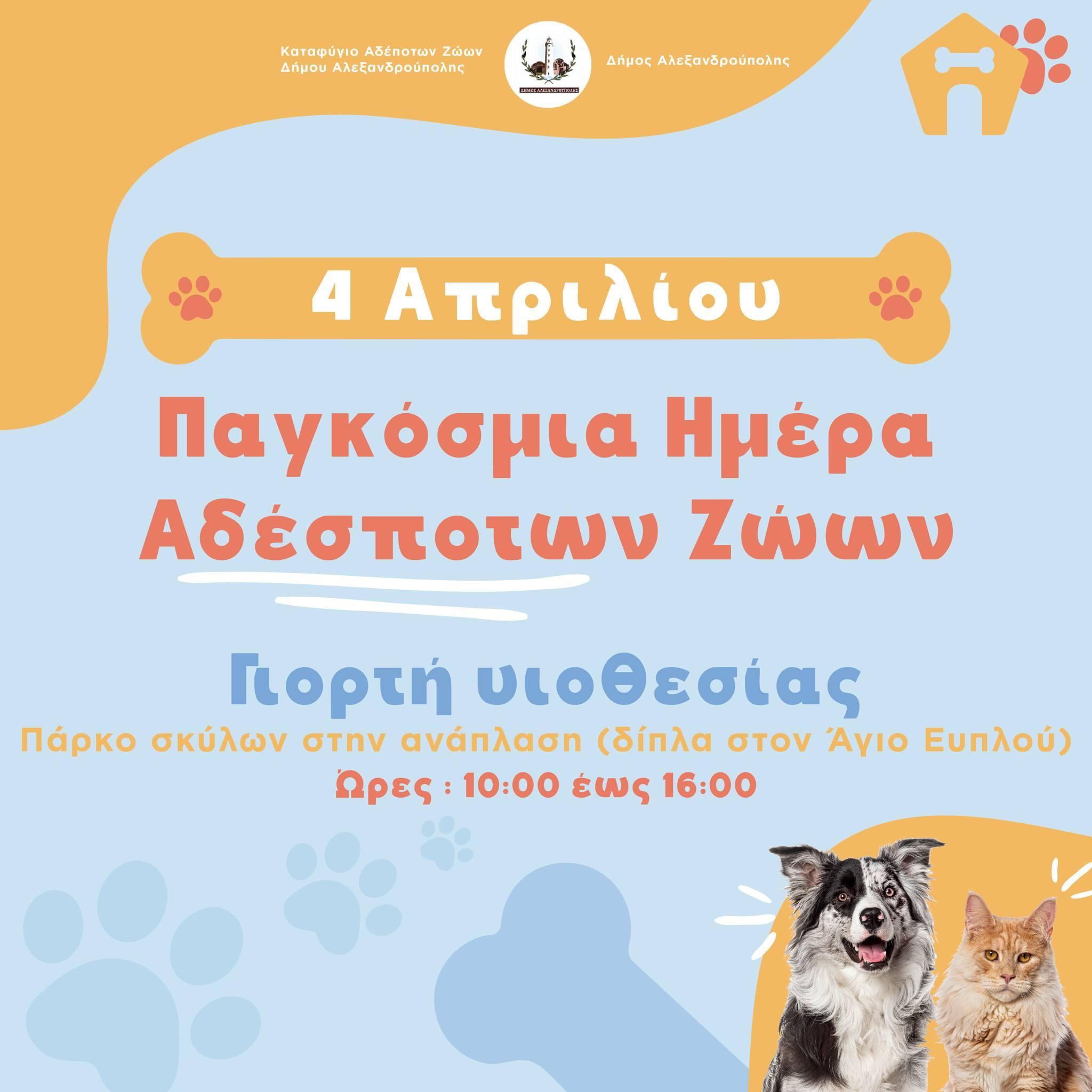 Με αφορμή την Παγκόσμια Ημέρα Αδέσποτων Ζώων, ο Δήμος Αλεξανδρούπολης σας προσκαλεί στη Γιορτή Υιοθεσίας, την Πέμπτη 4 Απριλίου στο Πάρκο Σκύλων στην ανάπλαση της παραλιακής, ώρες 10.00-16.00.