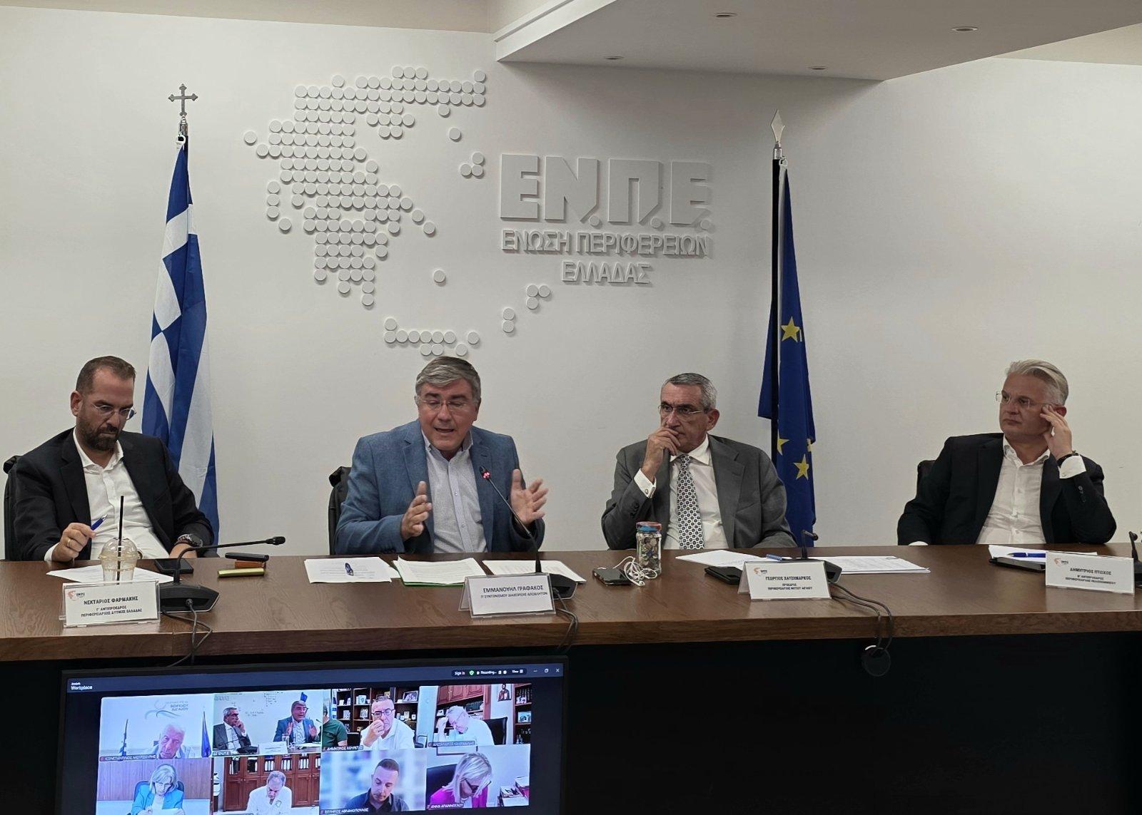 Με τη συμμετοχή δύο Γενικών Γραμματέων του Υπουργείου Περιβάλλοντος και Ενέργειας πραγματοποιήθηκε η συνεδρίαση του Διοικητικού Συμβουλίου της Ένωσης Περιφερειών Ελλάδας (ΕΝΠΕ). Συγκεκριμένα, παρόντες ήταν ο Γενικός Γραμματέας Συντονισμού Διαχείρισης Αποβλήτων, Μανώλης Γραφάκος, και ο Γενικός Γραμματέας Χωρικού Σχεδιασμού και Αστικού Περιβάλλοντος, Ευθύμιος Μπακογιάννης.