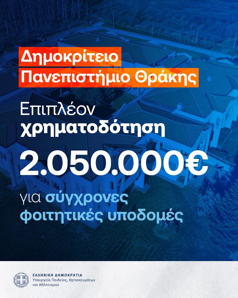 To Υπουργείο Παιδείας, Θρησκευμάτων και Αθλητισμού ενισχύει το Δημοκρίτειο Πανεπιστήμιο Θράκης με νέα χρηματοδότηση ύψους 2.050.000 € για έργα αναβάθμισης υποδομών. Πιο συγκεκριμένα θα δοθούν: