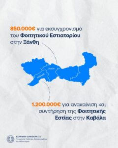 – 1.200.000 € για τη συντήρηση και ανακαίνιση της Φοιτητικής Εστίας στην Πανεπιστημιούπολη Καβάλας.