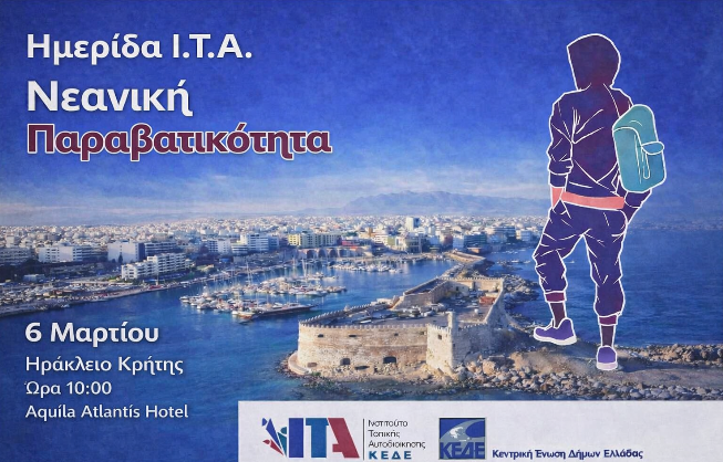 Ημερίδα με θέμα «Η Αυτοδιοίκηση δίπλα στη Νέα Γενιά – Σχέδιο Δράσης για την Πρόληψη της Νεανικής Παραβατικότητας» διοργανώνουν η Κεντρική Ένωση Δήμων Ελλάδας (ΚΕΔΕ), σε συνεργασία με το Ινστιτούτο Τοπικής Αυτοδιοίκησης (ΙΤΑ). Θα πραγματοποιηθεί στις 6 Μαρτίου 2026, στο ξενοδοχείο Aquila Atlantis Hotel, στο Ηράκλειο της Κρήτης.