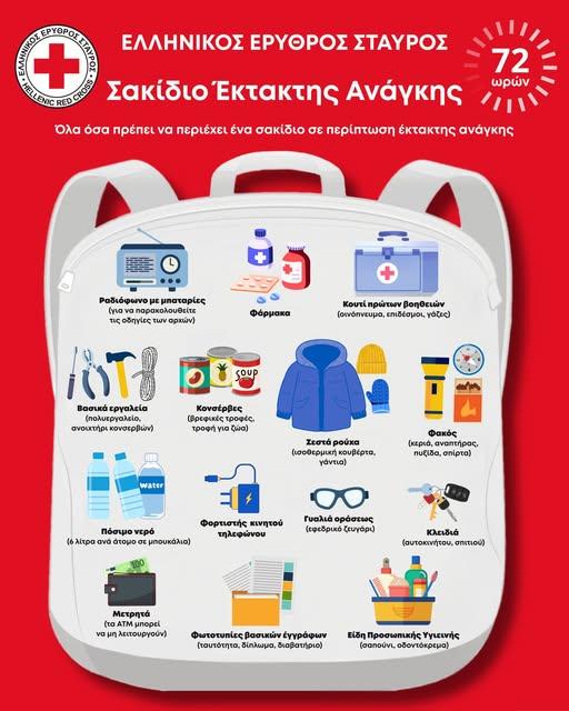 Ο Ελληνικός Ερυθρός Σταυρός, στο πλαίσιο της διαρκούς ενημέρωσης και εκπαίδευσης των πολιτών για την αντιμετώπιση έκτακτων καταστάσεων, προτείνει τα απαραίτητα είδη που θα πρέπει να περιλαμβάνει ένα σακίδιο επιβίωσης.