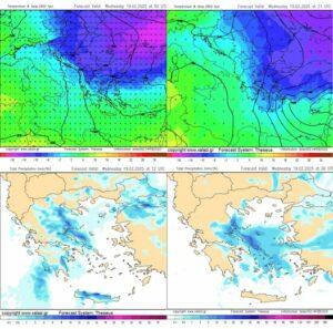Για την διαμόρφωση των χαρτών αυτών χρησιμοποιήσαμε το παγκόσμιο προγνωστικό μας σύστημα “ΗΡΑΚΛΗΣ” αλλά και το παγκόσμιο προγνωστικό σύστημα “ECMWF” τα δεδομένα των οποίων παγκόσμιων συστημάτων τα εισαγάγαμε στο περιοχικό μας προγνωστικό σύστημα “ΘΗΣΕΑΣ” προκειμένου να δούμε με περισσότερη λεπτομέρεια την κατάσταση.