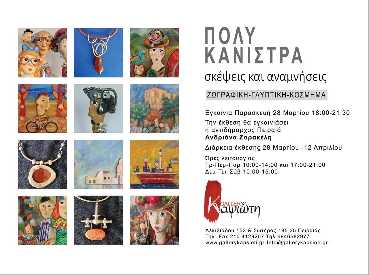 Στην έκθεση «Σκέψεις & αναμνήσεις» , τα γλυπτά της Πόλυς Κάνιστρα συνυπάρχουν και συνομιλούν με ζωγραφικά έργα μικτής τεχνικής στα οποία ο εξπρεσιονισμός συνδιαλέγεται με τον υπερρεαλισμό και η εικόνα αποκτά νέα διάσταση καθώς εμπλουτίζεται με ανάγλυφες μορφές.