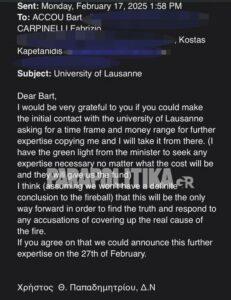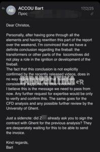 Αποκαλυπτικά είναι τα μέιλ που αντάλλαξαν για την πυρόσφαιρα μετά τη σιδηροδρομική τραγωδία στα Τέμπη, ο αναπληρωτής πρόεδρος του ΕΟΔΑΣΑΑΜ, Χρήστος Παπαδημητρίου και ο νούμερο 2 του Ευρωπαϊκού Οργανισμού Σιδηροδρόμων, Μπαρτ Άκου. Στα μέιλ που έχει στην κατοχή του το parapolitika.gr, φαίνεται ξεκάθαρα πως η ελληνική πλευρά ζητά να χυθεί άπλετο φως στα αίτια που προκάλεσαν την πυρόσφαιρα μετά τη σφοδρή σύγκρουση των δύο αμαξοστοιχιών τον μοιραίο Φεβρουάριο του 2023, αλλά ο Ελβετός πραγματογνώμονας δεν το θεωρεί απαραίτητο.