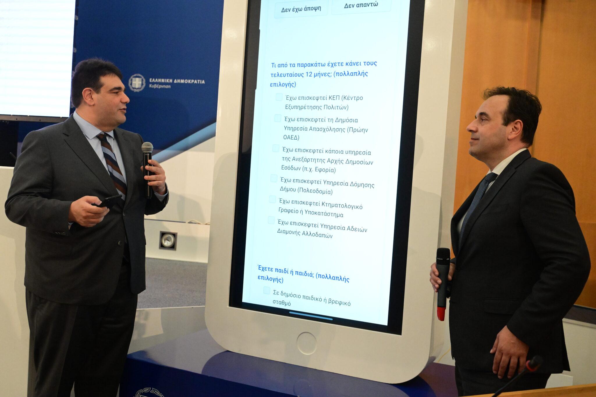 Ο υπουργός Εσωτερικών τόνισε ότι η πλατφόρμα είναι «προσβάσιμη από το gov.gr και είναι προσβάσιμη από τα άτομα με αναπηρία. Είναι ένα ολοκληρωμένο ερωτηματολόγιο ποσοτικής έρευνας. Αυτό θα τρέχει δύο φορές τον χρόνο Απρίλιος-Μάιος και Οκτώβριος-Νοέμβριος». Εξήγησε, επίσης, ότι «βάλαμε πρόσβαση με κωδικούς Taxisnet ώστε και να διασφαλίζεται η ανωνυμία και η μοναδικότητα της συμμετοχής. Τα μόνα στοιχεία που συλλέγονται είναι η διεύθυνση κατοικίας και ο ταχυδρομικός κώδικας». Από την πλευρά του ο υπουργός Ψηφιακής Διακυβέρνησης, Δημήτρης Παπαστεργίου, υπογράμμισε ότι είναι μια «κομβική στιγμή για το ελληνικό δημόσιο, δεν έχει κανένα πρόβλημα το Δημόσιο να εκτεθεί για να πάρει πίσω απαντήσεις. Θέλουμε 7-8 λεπτά για να κάνουμε το Δημόσιο καλύτερο». Διευκρίνισε ότι δεν υπάρχουν για την ώρα ερωτήσεις για το θέμα της υγείας, γιατί δημιουργείται ξεχωριστό ερωτηματολόγιο για τις υπηρεσίες Υγείας.