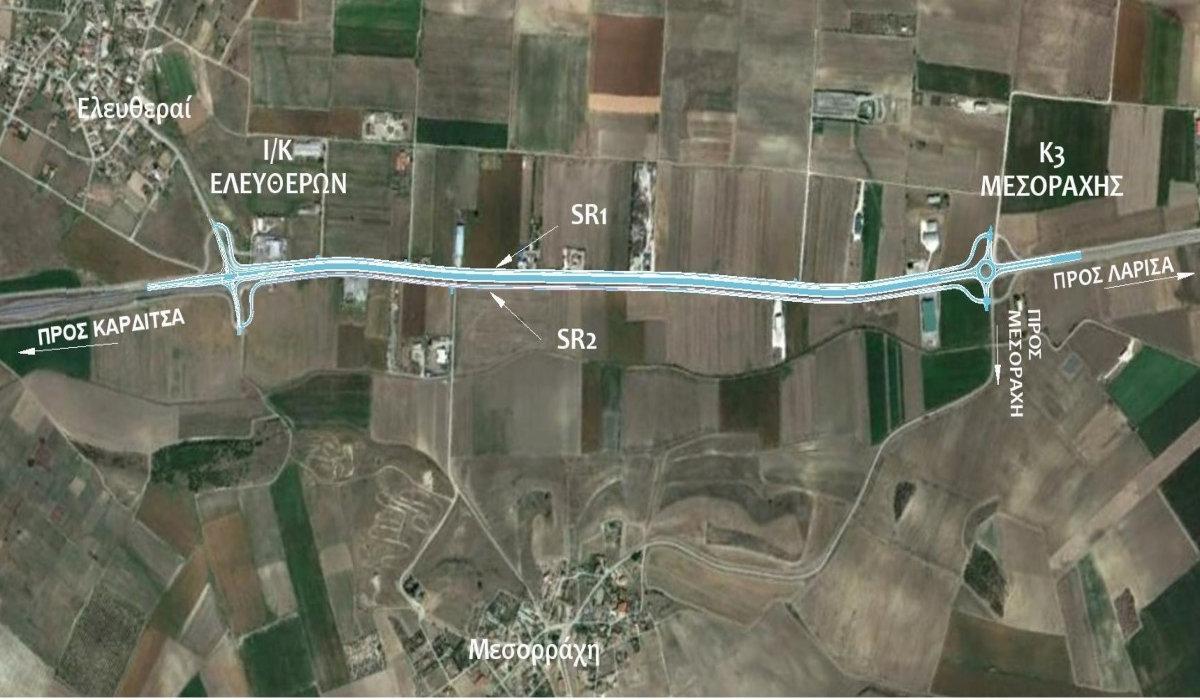 Το έργο αφορά στη βελτίωση του τμήματος της Επαρχιακής Οδού Λάρισας –Καρδίτσας, από τον ισόπεδο κόμβο (Ι/Κ) Μεσοράχης έως τον Ι/Κ Ελευθερών, μήκους 2,15 χλμ.Συγκεκριμένα περιλαμβάνει:- Την Διαπλάτυνση του τμήματος της Επ.Ο. Λαρίσης – Καρδίτσας στο τμήμα από Ι/Κ Μεσοράχης έως Ι/Κ Ελευθερών μήκους 2,15 χλμ.- Την κατασκευή παράπλευρων οδών κυκλοφορίας.- Την τροποποίηση του υφιστάμενου Ι/Κ Μεσοράχης σε κυκλικό και την προσαρμογή του στη νέα τυπική διατομή του νέου τμήματος Ι/Κ Μεσοράχης – Ι/Κ Ελευθερών.- Την προσαρμογή του υφιστάμενου Ι/Κ Ελευθερών στη νέα τυπική διατομή του νέου τμήματος Ι/Κ Μεσοράχης – Ι/Κ Ελευθερών.Για την κύρια αρτηρία εφαρμόζεται τυπική διατομή κύριας οδού με 2+2 λωρίδες κυκλοφορίας πλάτους 7,00m+7,00m και αμφίπλευρο μεταλλικό στηθαίο ασφαλείας στον άξονα της αρτηρίας.