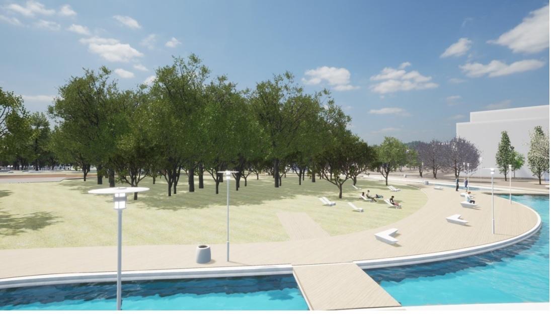 – Η σημερινή πρόταση φέρνει αυτό το στοιχείο του νερού στο ξέφωτο της παιδικής χαράς, το εντάσσει στην δραστηριότητα του παιχνιδιού στο κέντρο της ενότητας, αλλά και στο πνεύμα που επιβάλλει το νέο δημαρχείο στο όριο της οδού Μυρμιδόνων. Έτσι προστίθενται παιχνίδια ισορροπίας πάνω από το νερό αλλά και σιντριβάνια απέναντι από το δημαρχείο σε ένα κανάλι 500 περίπου μ2 που αλλάζουν δραστικά την εικόνα και προσθέτουν στο μικροκλίμα του πάρκου.