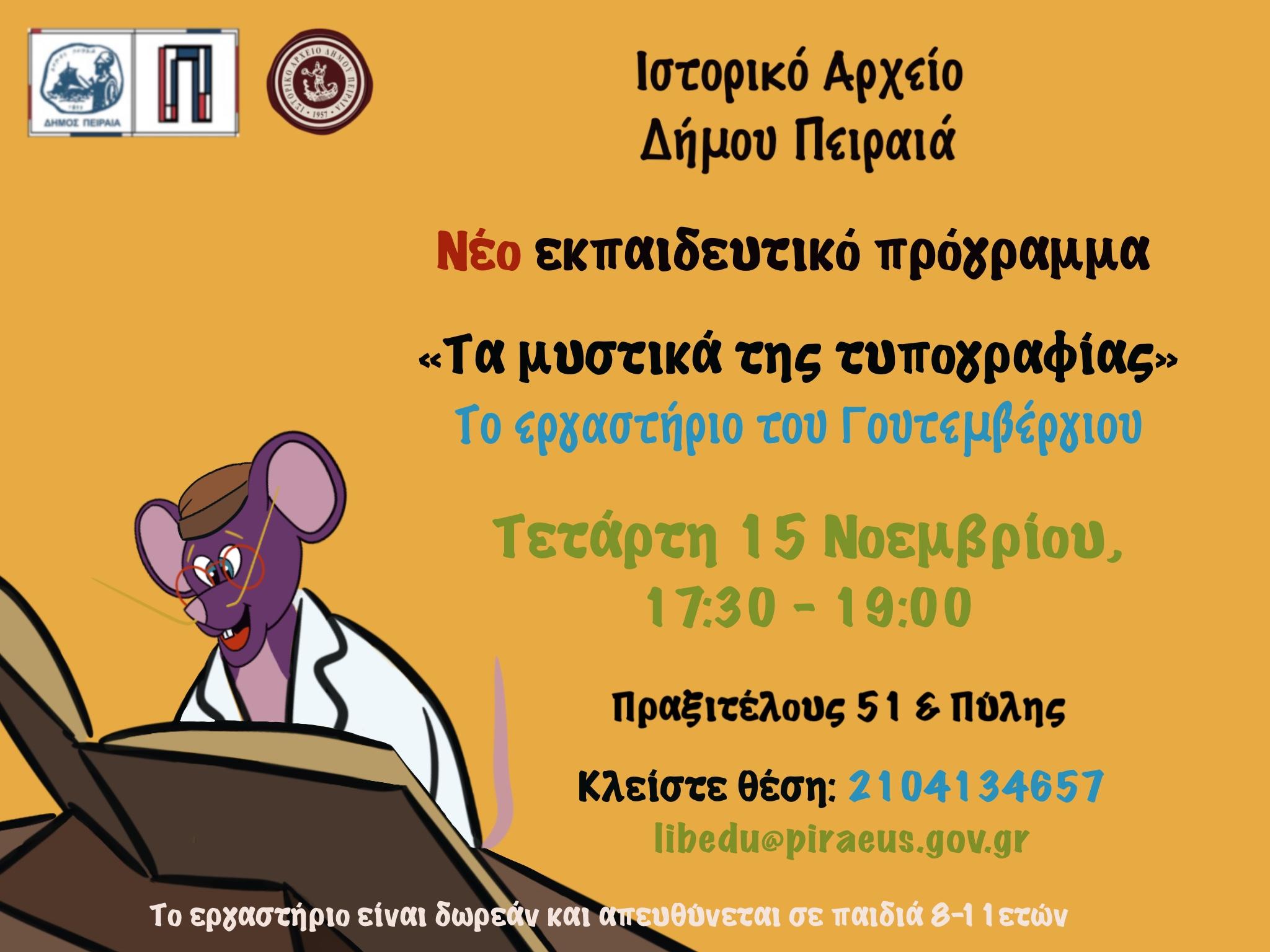 Το εκπαιδευτικό πρόγραμμα θα υλοποιηθεί από τις 17:30 έως τις 19:00, για παιδιά ηλικίας από 8 έως 11 ετών, στο «εργαστήριο του Γουτεμβέργιου», στο Ιστορικό Αρχείο του Δήμου Πειραιά.