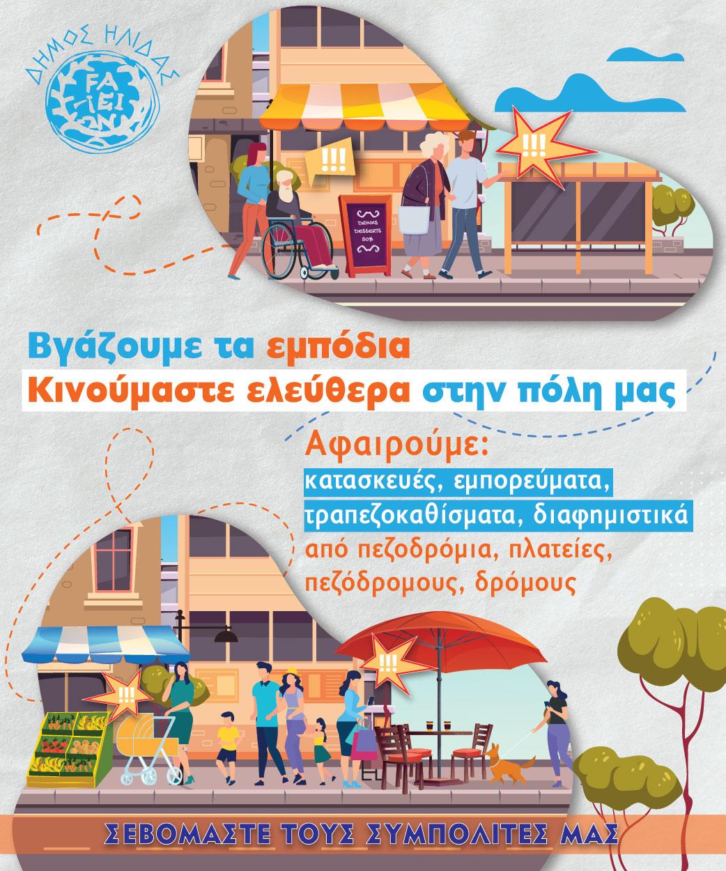 Όπως είναι ήδη γνωστό, ο Δήμος Ήλιδας έχει ξεκινήσει εδώ και έναν μήνα εκστρατεία ενημέρωσης για την ελευθέρωση των κοινόχρηστων χώρων και την απόδοσή τους προς ελεύθερη χρήση και διευκόλυνση της διάβασης των δημοτών.