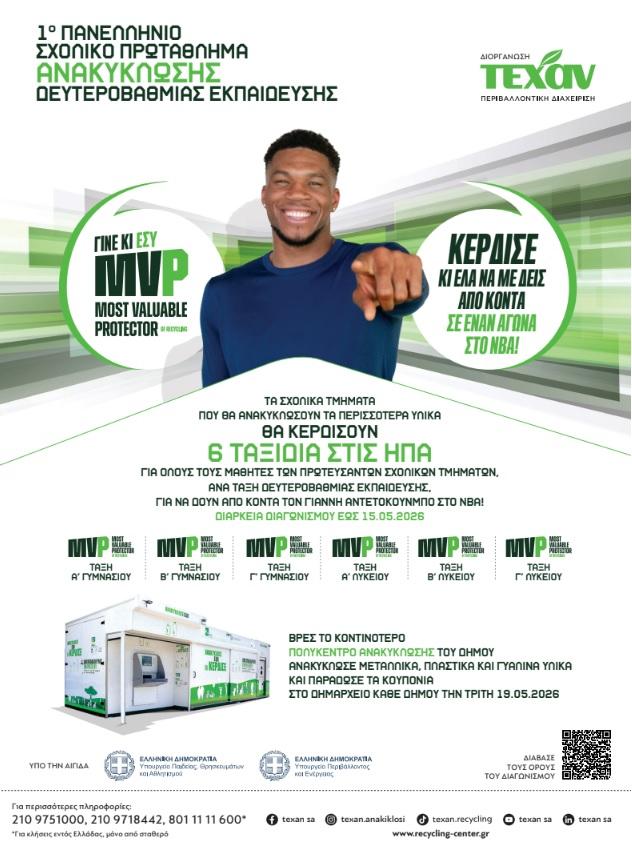 Το «1ο Πανελλήνιο Σχολικό Πρωτάθλημα Ανακύκλωσης» που διεξάγεται ήδη στην Καλαμάτα, πραγματοποιείται στο πλαίσιο της ανακήρυξης του Γιάννη Αντετοκούνμπο ως «Most Valuable Protector της Ανακύκλωσης στην Ελλάδα», δηλαδή MVP της ανακύκλωσης στη χώρα μας.