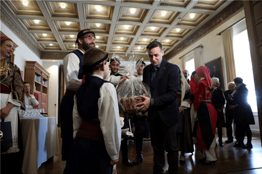Ο Χάρης Δούκας άκουσε σήμερα στο γραφείο του στο Δημαρχείο Αθηνών πρωτοχρονιάτικα κάλαντα από τη Χίο και τη Μακεδονία που έψαλαν οι μαθητές του Μουσικού Σχολείου Αθηνών, με τη συνοδεία λαούτου, βιολιού και κρουστού. Παραδοσιακά κάλαντα είπαν στον Δήμαρχο Αθηναίων και μέλη της Ένωσης Κρητών Κορινθίας «Ο Ψηλορείτης», τα οποία χόρεψαν κρητικούς χορούς.
