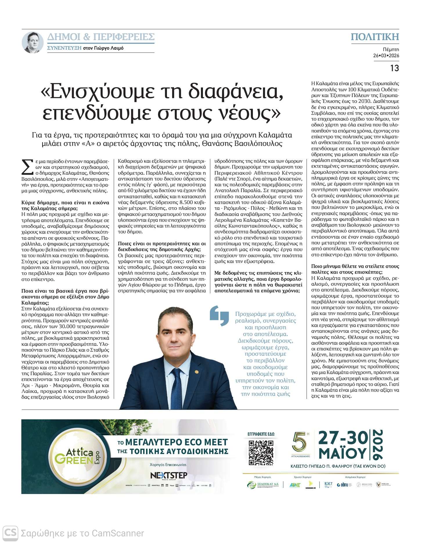 Σε μια περίοδο έντονων παρεμβάσεων και στρατηγικού σχεδιασμού, ο Δήμαρχος Καλαμάτας Θανάσης Βασιλόπουλος μιλά στην «Απογευματινή» για έργα, προτεραιότητες και το όραμα μιας σύγχρονης, ανθεκτικής πόλης.
