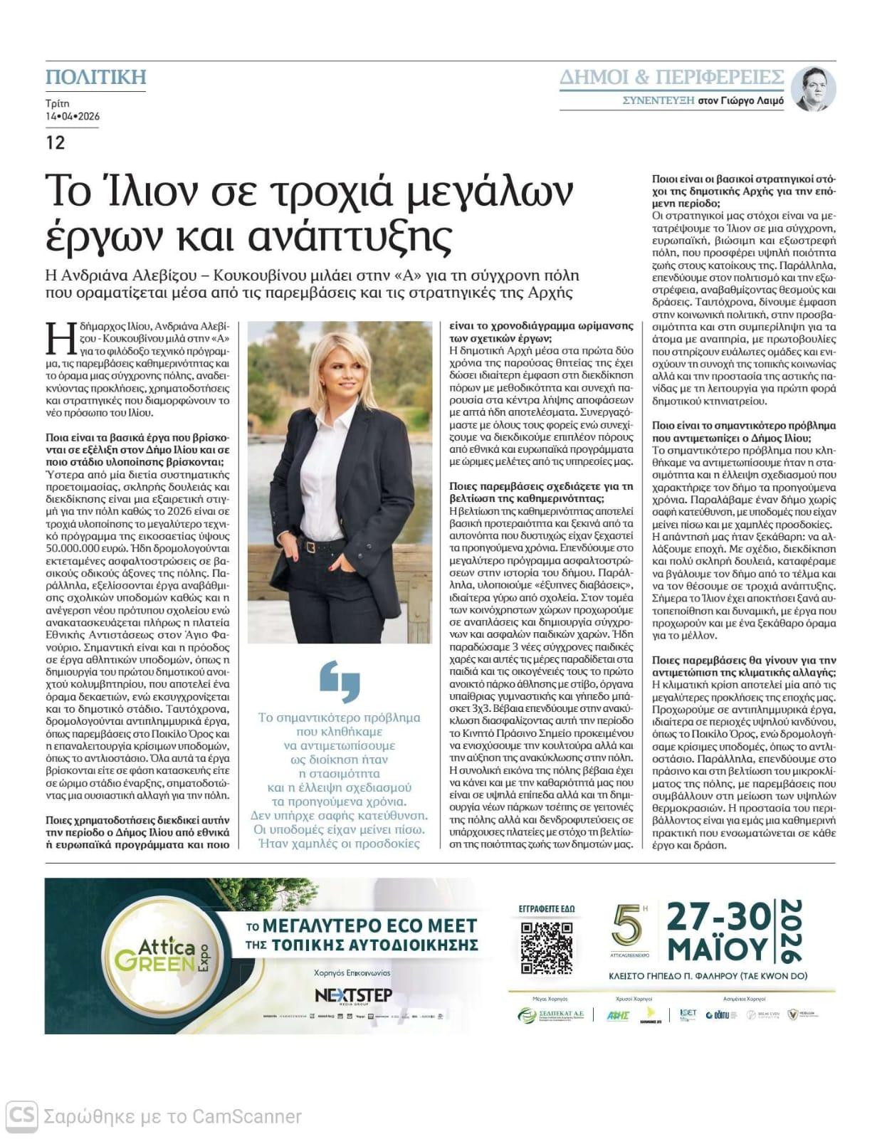 Η Δήμαρχος Ιλίου Ανδριάνα Αλεβίζου Κουκουβίνου μιλά στην «Α» για το φιλόδοξο τεχνικό πρόγραμμα, τις παρεμβάσεις καθημερινότητας και το όραμα μιας σύγχρονης πόλης, αναδεικνύοντας προκλήσεις, χρηματοδοτήσεις και στρατηγικές που διαμορφώνουν το νέο πρόσωπο του Ιλίου.
