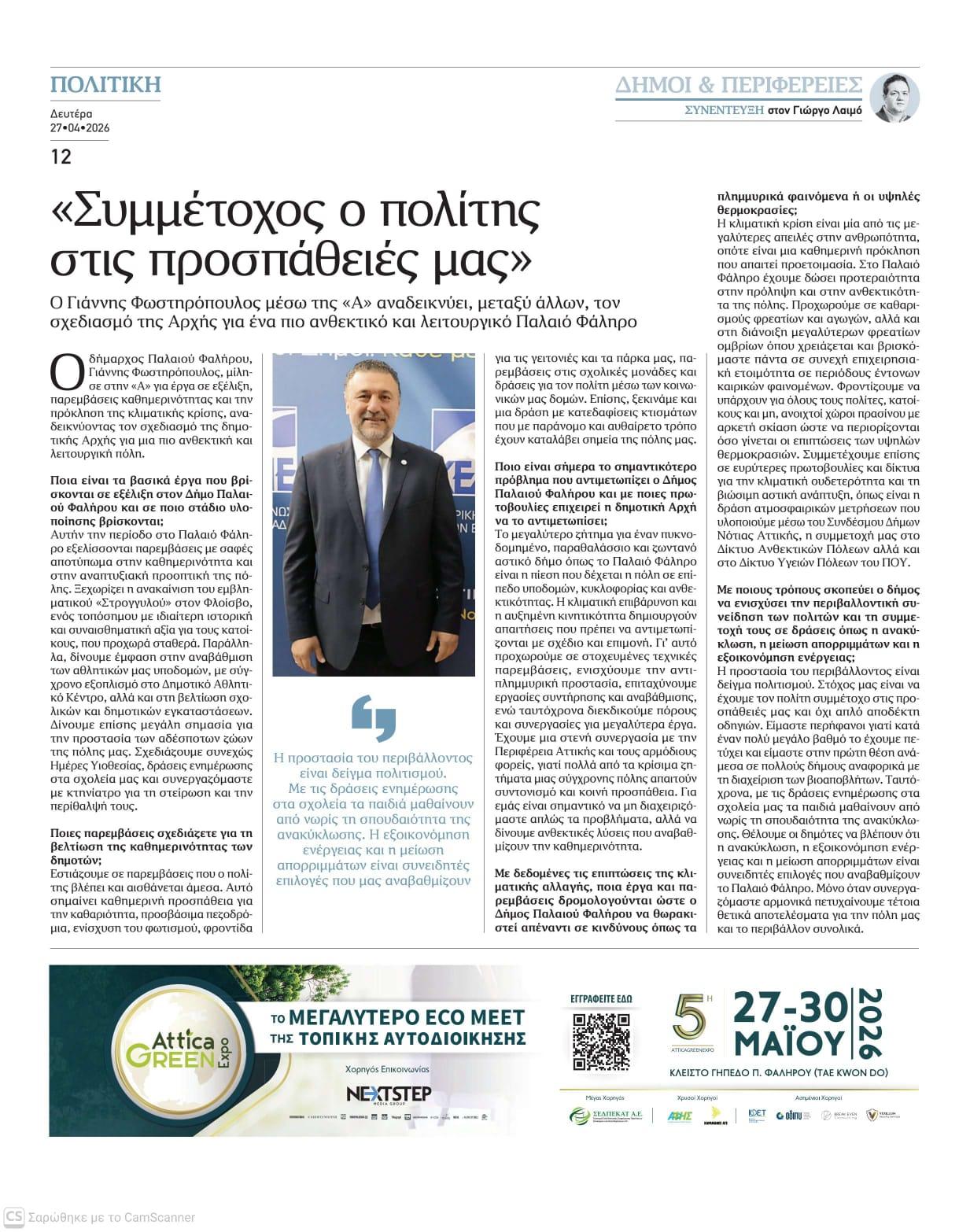 Ο Δήμαρχος Παλαιού Φαλήρου Γιάννης Φωστηρόπουλος μίλησε στην «Α» για έργα σε εξέλιξη, παρεμβάσεις καθημερινότητας και την πρόκληση της κλιματικής κρίσης, αναδεικνύοντας τον σχεδιασμό της δημοτικής αρχής για μια πιο ανθεκτική και λειτουργική πόλη.